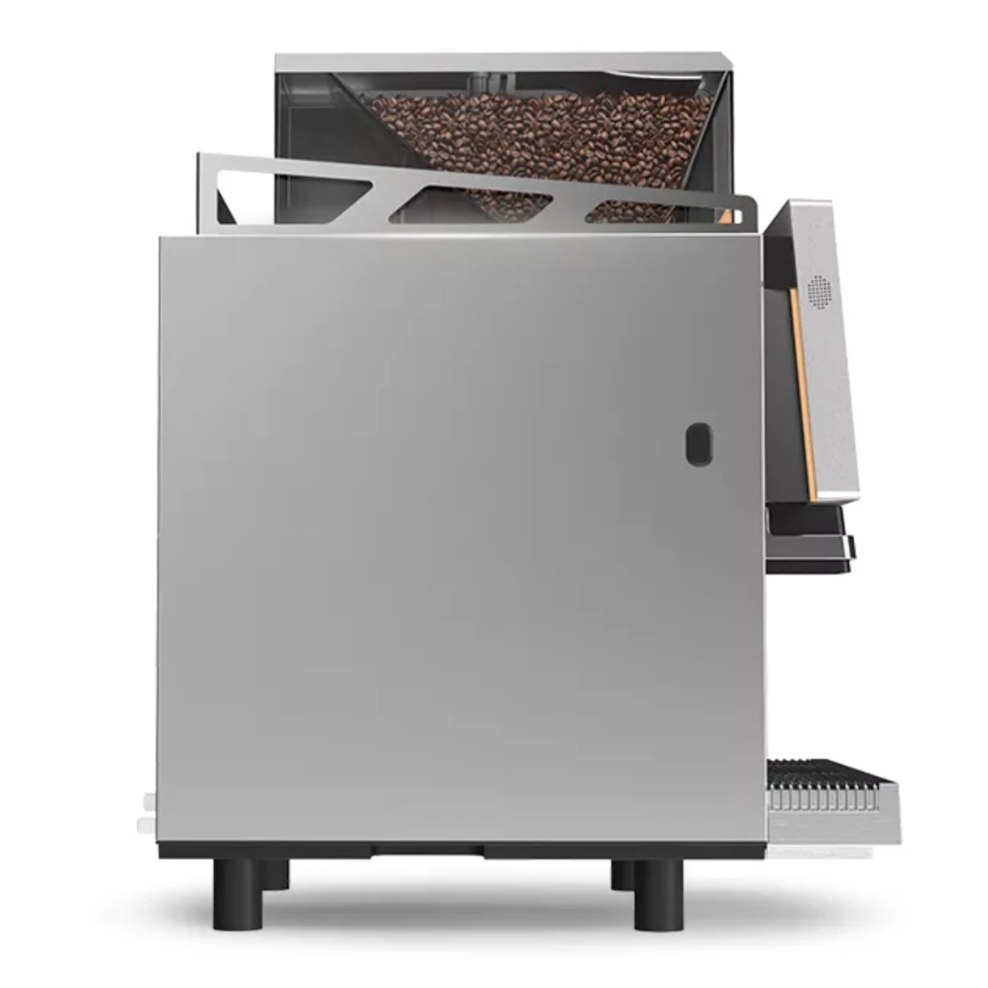 | Dodatkowe informacje | Możliwość wgrania filmów reklamowych, zmiana koloru podświetlenia pojemników i obudowy, ekspres wyposażony w 2 młynki oraz pompę mleka pozwalającą na instalację lodówki pod blatem. |