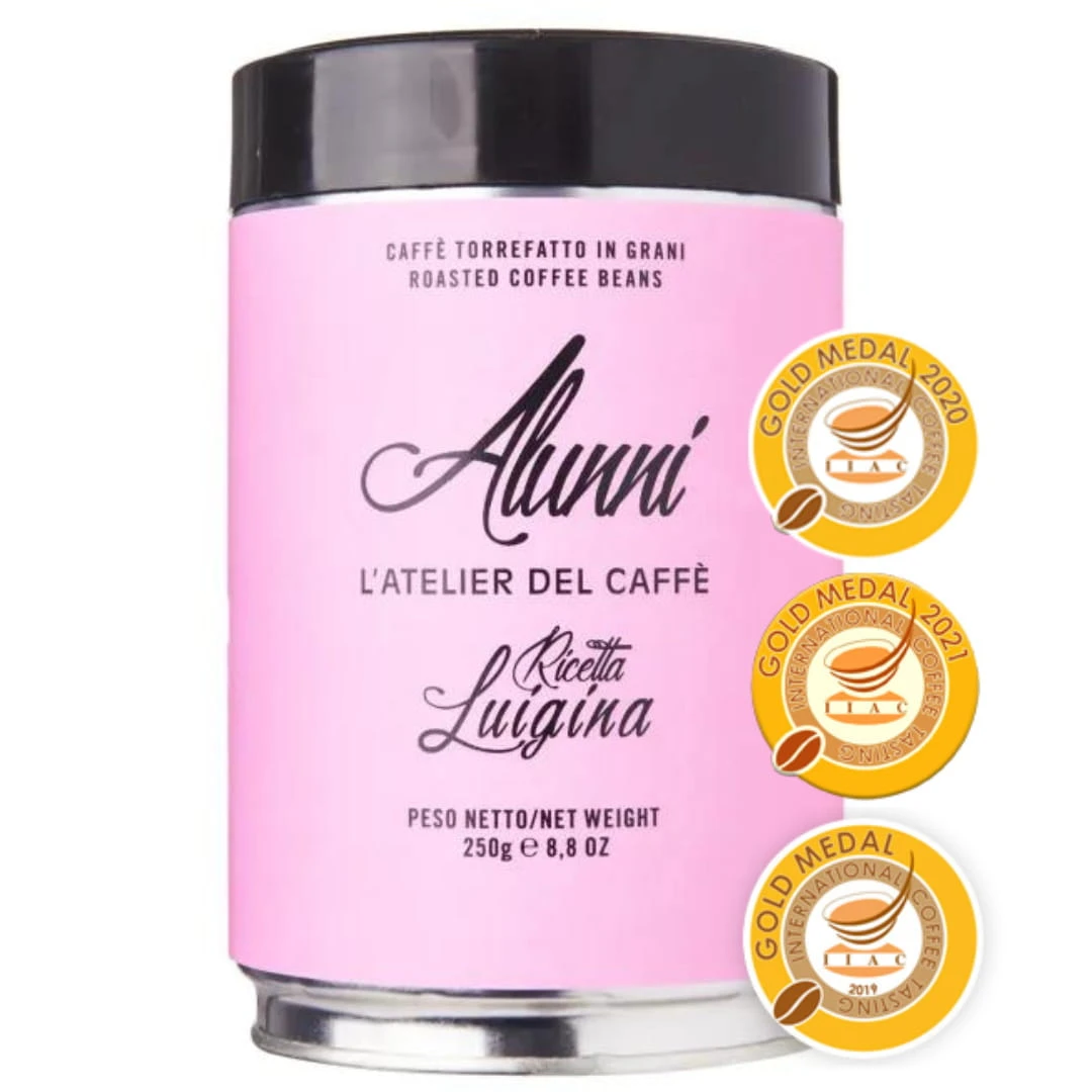 Alunni Ricetta Luigina 250g – włoska kawa ziarnista premium, nagradzana za najlepszy smak espresso (2019, 2020, 2021). Subtelna mieszanka 80% Arabiki i 20% Robusty o niskiej kwasowości, nutach orzechów, tostów i ciastek korzennych. Idealna do espresso, cappuccino i latte.