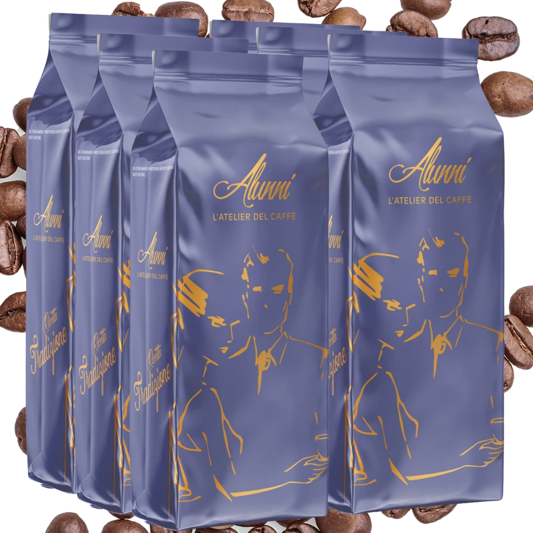 Włoska kawa ziarnista Alunni Tradizione 6x1kg – intensywna mieszanka 80% Robusty i 20% Arabiki, o wysokiej zawartości kofeiny. Nuty smakowe czekolady, fig, i moreli, idealna dla miłośników espresso i mocnych kaw.
