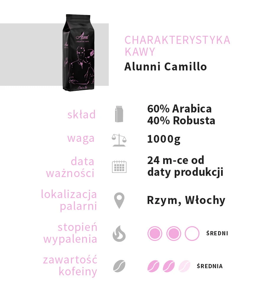 Alunni Camillo sprawdzi się w każdym ekspresie automatycznym, kolbowym, a po odpowiednim zmieleniu także w kawiarce czy frenchpressie. Doskonała zarówno jako intensywne espresso, jak i delikatne latte macchiato.