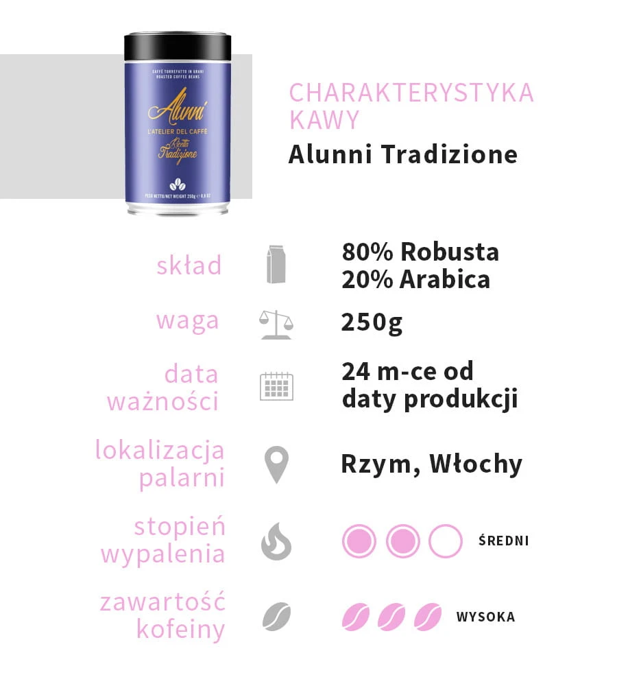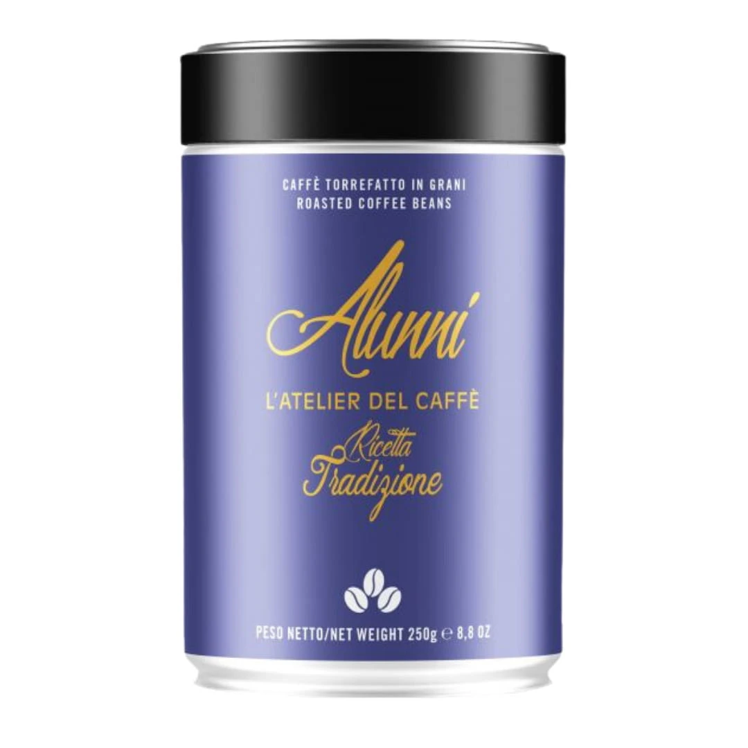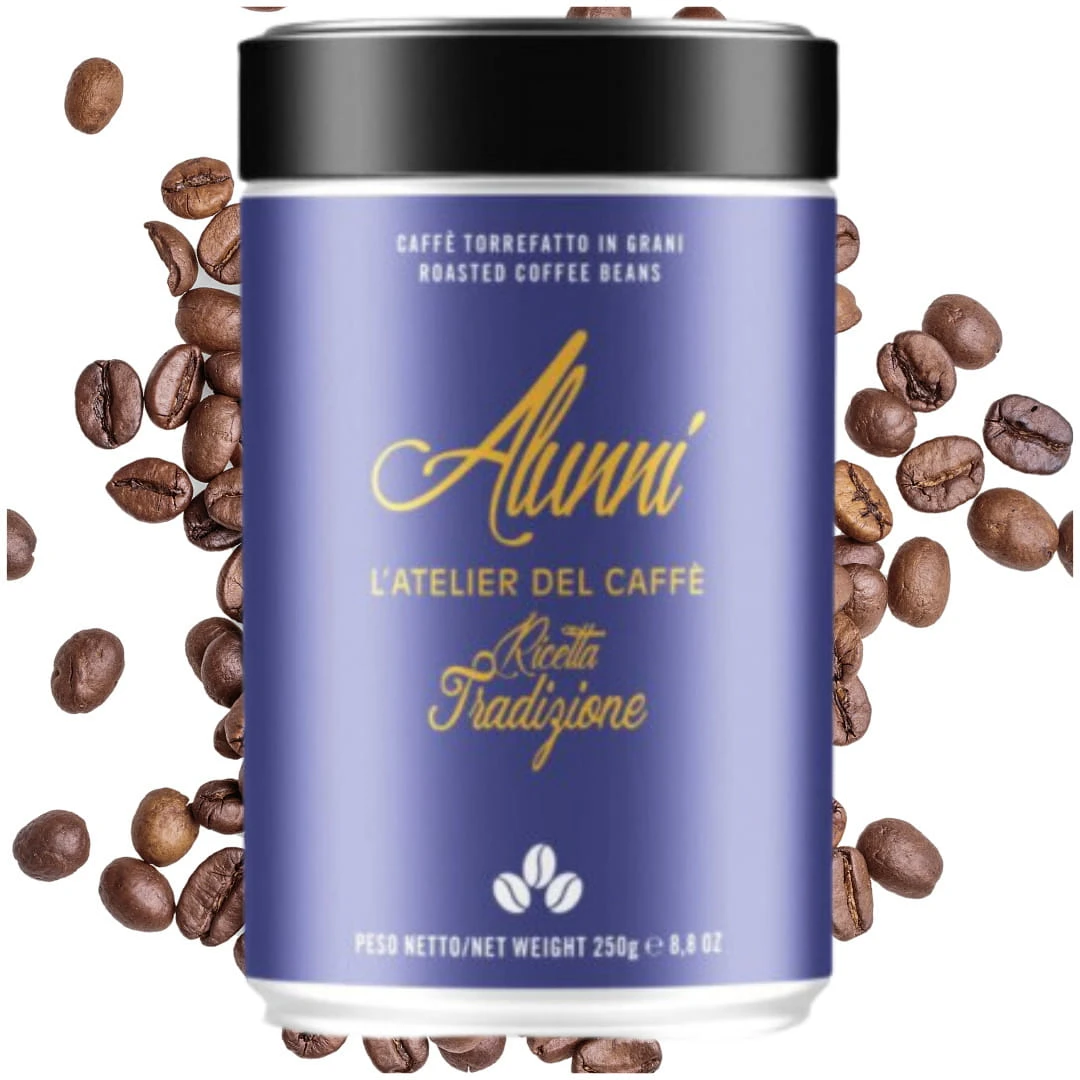 Alunni Tradizione 250g – włoska kawa ziarnista z rodzinnej palarni w Rzymie. Mieszanka 80% Robusty i 20% Arabiki o intensywnym smaku, niskiej kwasowości i wysokiej zawartości kofeiny. Nuty smakowe: czekolada, figi, suszone owoce. Idealna dla miłośników espresso i café crème.
